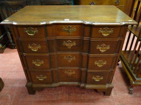A Federal American style reproduction mahogany chest of four drawers, the moulded top over inverted serpentine drawers with brass blind escutcheons and matching backplates with swing handles on ogee bracket feet, interior brass plaque reads 'Hand crafted by Frederick Jones, '79', 79 x 91 x 53 cms