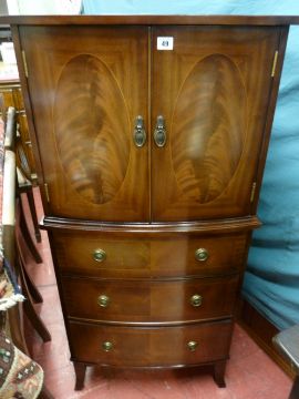 A reproduction mahogany bow front two door cupboard on chest, the three drawers with brass ring pull handles on splayed feet, 129 x 61.5 cms