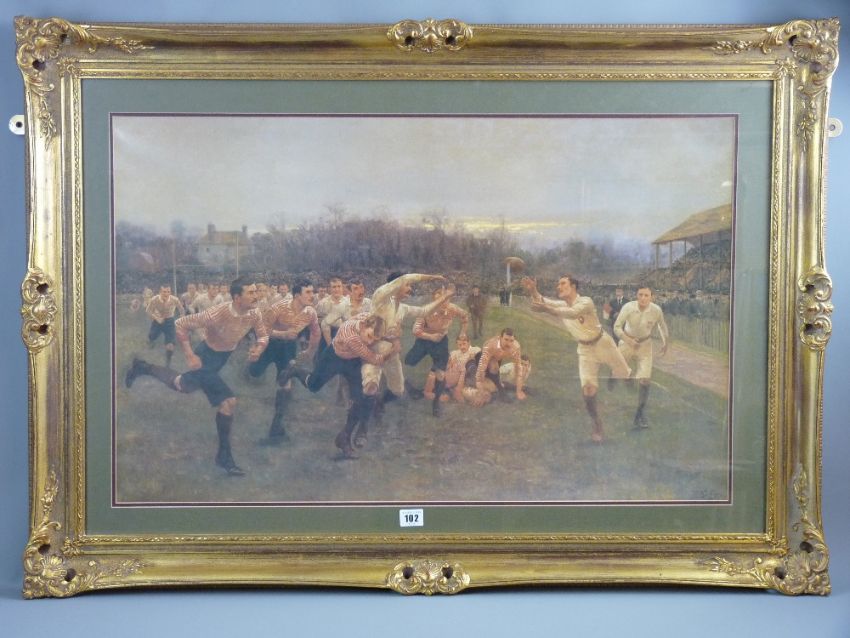 After WILLIAM BARNES WOLLEN coloured print - early rugby scene in progress with crowds in a stand, printed signature and date 1895, 50 x 80 cms