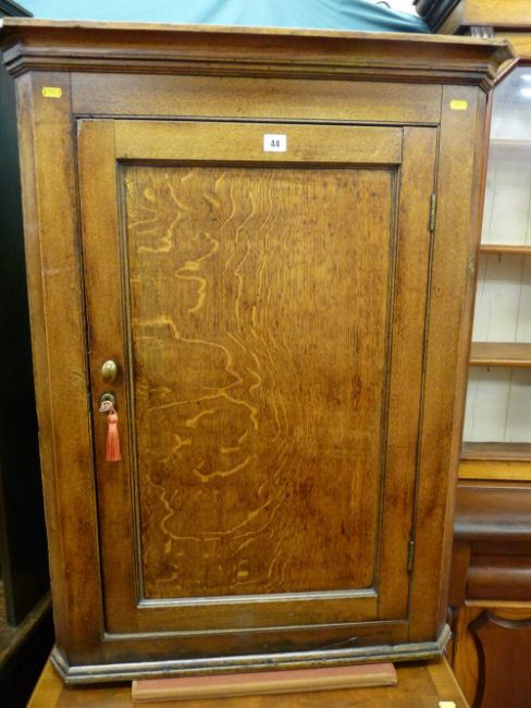 A Georgian oak single door hanging corner cupboard with brass knob and escutcheon with interior shelves, 100 x 76 cms approximately