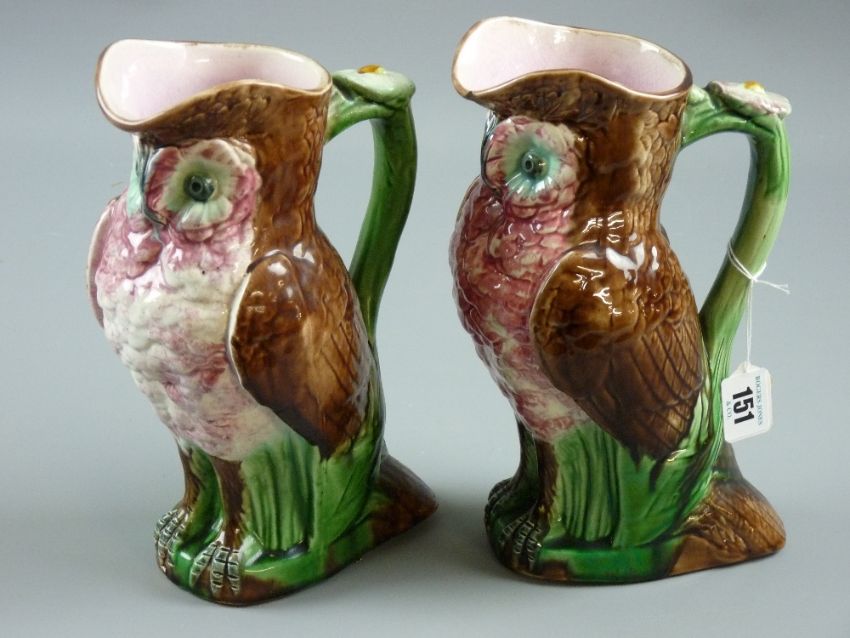 A pair of Majolica pottery owl jugs, 25 cms high (chip to base of one, 12mm chip with hairline crack to the spout of the other)