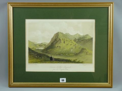 COLOURED LITHOGRAPH by Newman & Co, London, published by John Jones, Beddgelert - Snowdon & Llyn Gwynant from the Beddgelert Road with lady in Welsh attire and young girl on the hillside, 27 x 36 cms