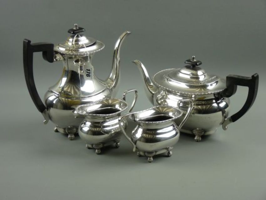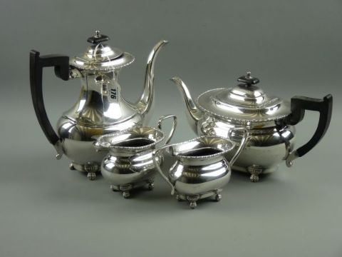 AN ELECTROPLATE FOUR PIECE VINERS TEA SET classically shaped with beaded rims, each piece raised on four ball feet