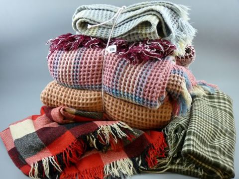 FOUR WELSH WOOLLEN WAFFLE BLANKETS and two tassel edged woollen throws, various designs and colours