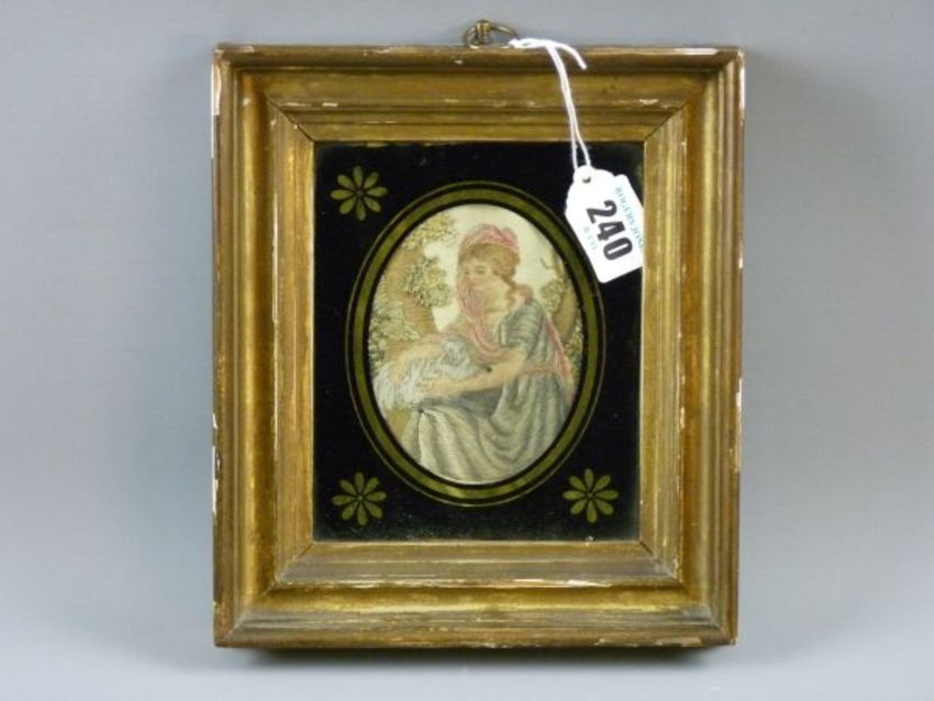 A SILK WORK PICTURE, an oval miniature silk work study of a seated lady with her pet with black gilt decorated glass mount and gilt wood frame, 9.5 x 7 cms