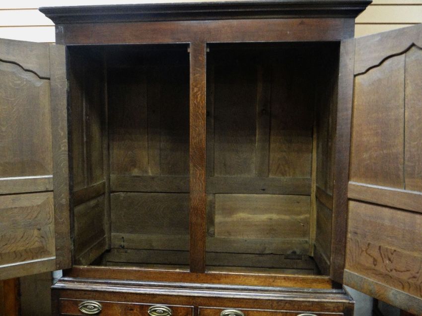 NINETEENTH CENTURY WELSH OAK TWO-STAGE PRESS CUPBOARD composed of a base of eight side-by-side graduated drawers, below a two door cupboard panelled top, all on bracket feet with brass handles, circa 1820, 195cms high x 133cms wide