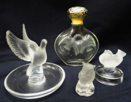 A LALIQUE GLASS DOVE DISH & A LALIQUE DOVE MASCOT together with a Nina Ricci Lalique scent bottle and a Nachtmann crystal glass owl mascot