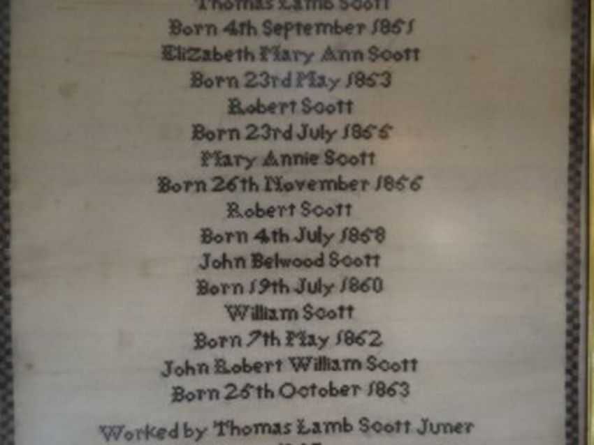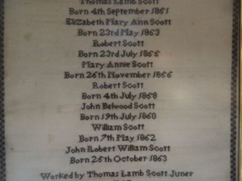 A MID-VICTORIAN FAMILY-TREE SAMPLER FOR THE SCOTT FAMILY, dated 1867, 60 x 50cms