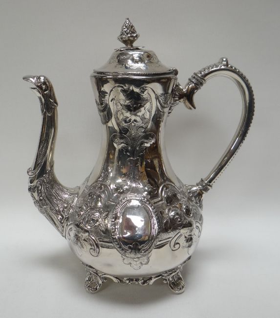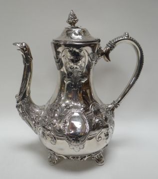 A BRITANNIA METAL COFFEE POT with all-round relief decoration of flowers and scrolls, with eagle-spout and on four scroll feet, 29ozs