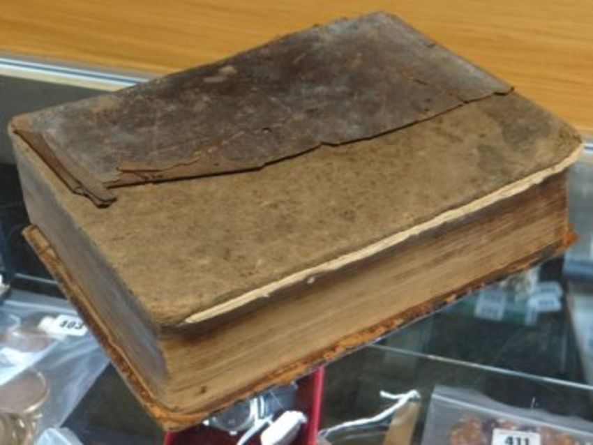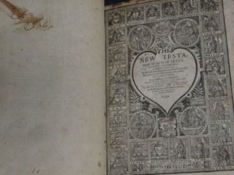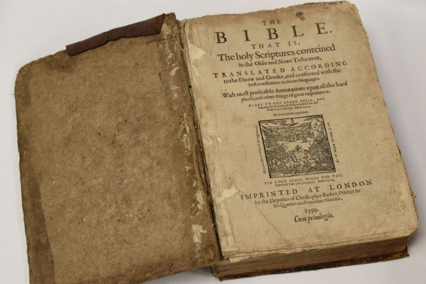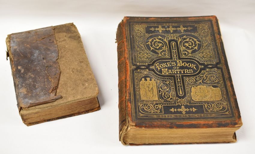 A VOLUME OF THE GENEVA OR 'BREECHES' BIBLE, DATED 1599 'IMPRINTED AT LONDON BY THE DEPUTIES OF CHRISTOPHER BARKER' with woodblock illustrations. The Geneva Bible (sometimes known as the 'Breeches Bible' for its reference to Adam and Eve clothing themselves in 'breeches' made from fig leaves). It was the first English edition of the Bible to be translated from the Greek and Hebrew texts TOGETHER WITH FOXE'S 'THE BOOK OF MARTYRS' printed by John G Murdoch