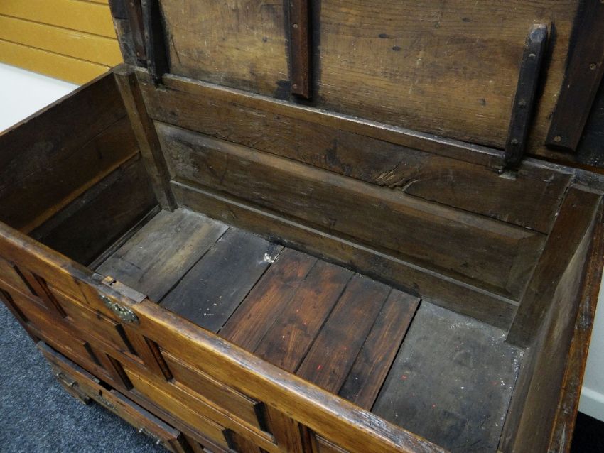 A NINETEENTH CENTURY PANELLED OAK BLANKET CHEST on bracket feet with two base drawers and hinged lid, 122cms wide