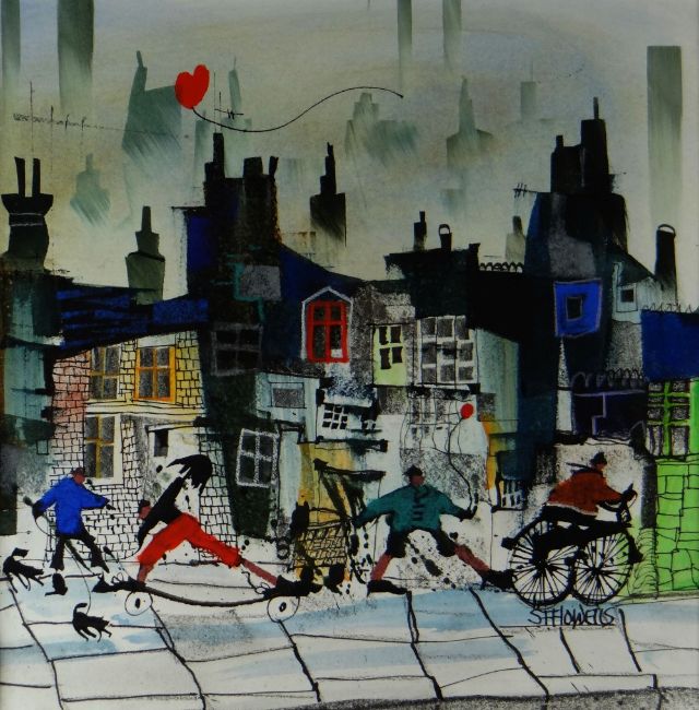 SUE HOWELLS mixed media - colourful street scene on a windy day with figures, entitled verso, 'Steady As She Goes', signed, 26 x 26cms