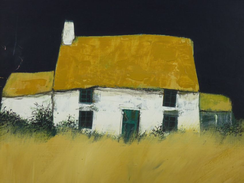 DAVID HUMPHREYS oil on board - old whitewashed cottage in a crop-field and with a dark background, signed, 44 x 44cms