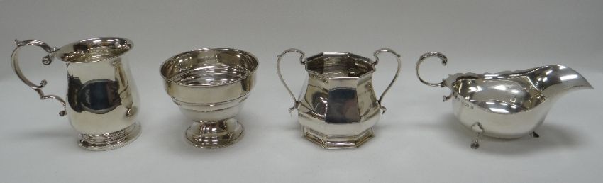 FOUR SILVER TABLEWARE ITEMS OF PLAIN FORM comprising a waisted C-scroll handle mug, a sauce boat and two sugar basins, 8.6ozs total