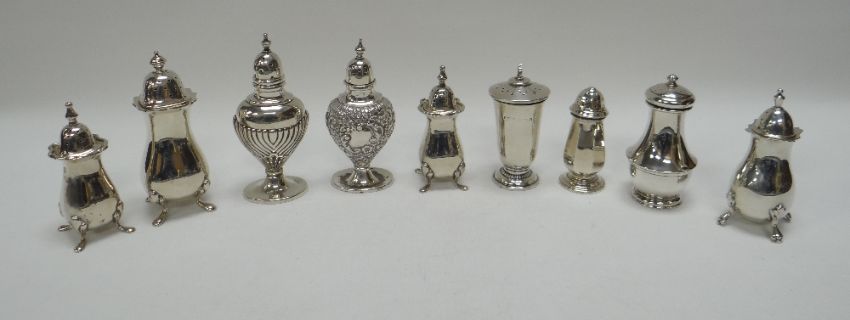 NINE SILVER PEPPERETTES of 'small' size and including a trio, 10ozs total
