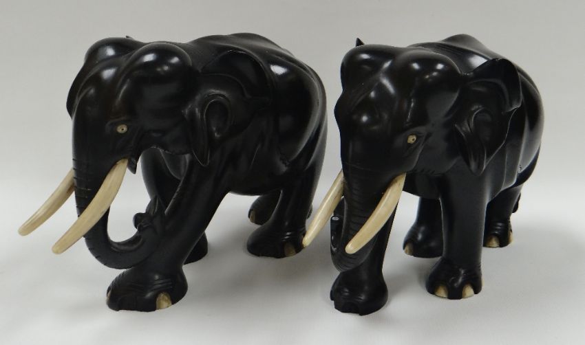 A PAIR OF EBONY ELEPHANTS, in walking position and with ivory tusks, 22cms long