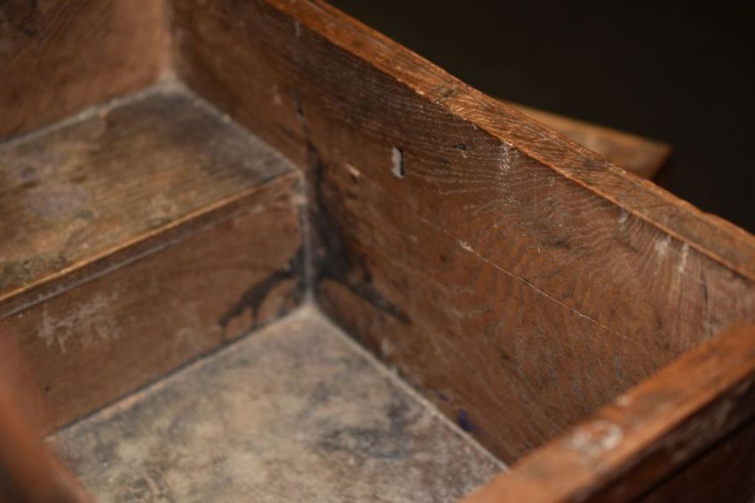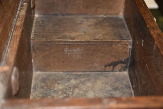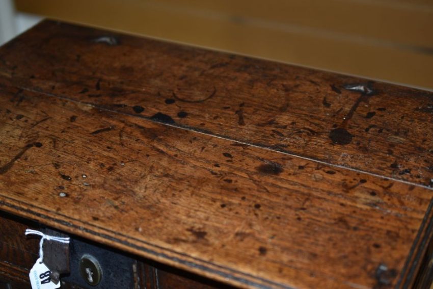 AN EIGHTEENTH CENTURY WELSH OAK COFFER-BACH of moulded panelled form with hinging lid above a single candle drawer to match an opposing false drawer and with metal lock-plate, all raised on bracket-feet, 46.25cms wide