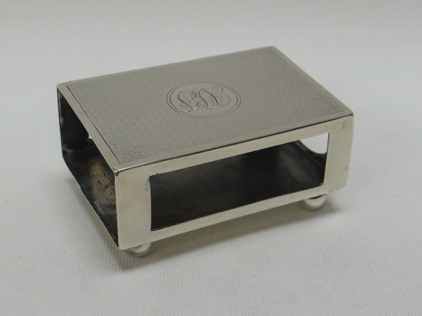 A SILVER TABLE-MATCHBOX HOLDER on ball feet and with machine turn decoration and monogram, London 1908, 1.9ozs