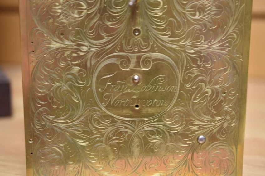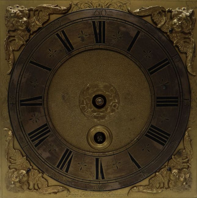 AN EARLY EIGHTEENTH CENTURY ENGLISH EBONISED BRACKET CLOCK BY FRANCIS ROBINSON, having an eight-day fusee movement, the brass dial with Roman numeral chapter ring signed 'Fran Robinson, Northampton' with similar inscription to the foliate engraved back-plate, the marquetry and ebony case on metallic ball corner feet and with gilt-brass scroll handle and filigree work to the basket-top, 36cms high (restoration required, key and accessories available to view on request)