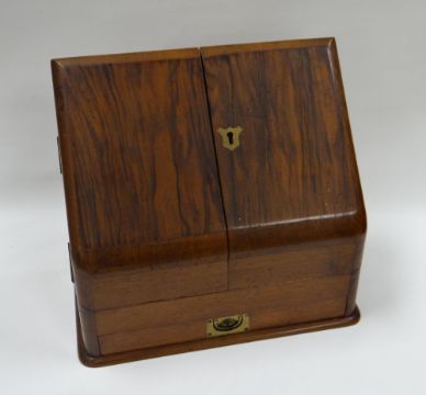 A MAHOGANY SLOPED STATIONERY CABINET with stepped interior and base drawers