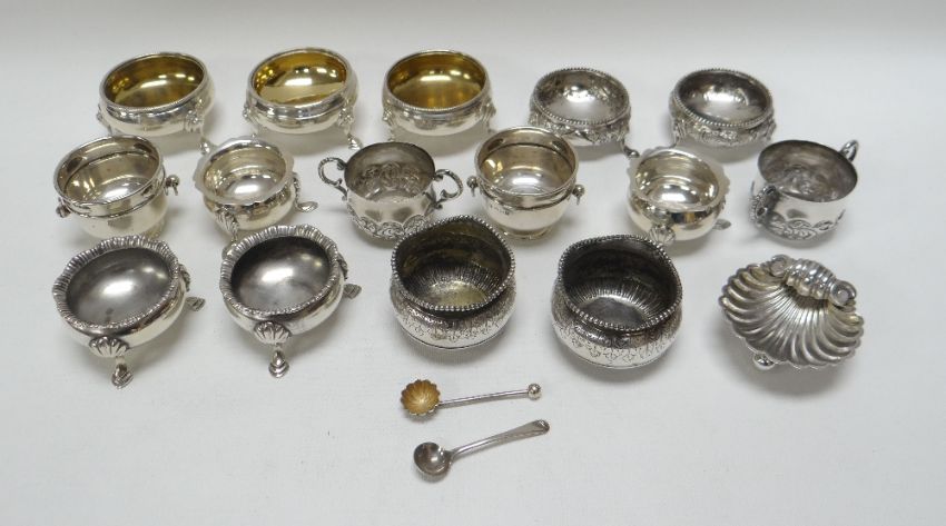 A GOOD COLLECTION OF SILVER SALTS comprising a near matching trio, six pairs and a single scallop-form, 17ozs total (approx)