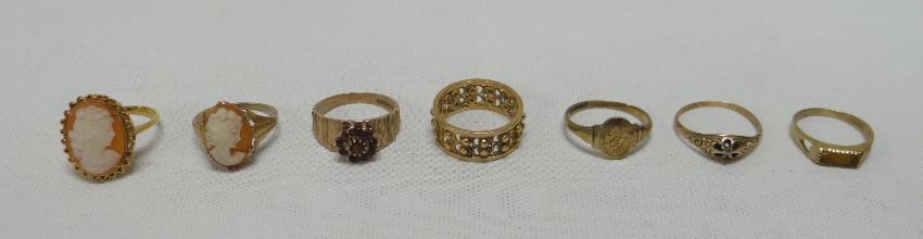 A PARCEL OF SEVEN GOLD / YELLOW METAL RINGS comprising four marked as 9ct and three unmarked including one believed to be Indian gold