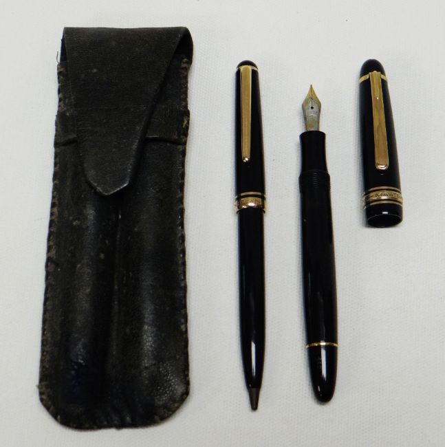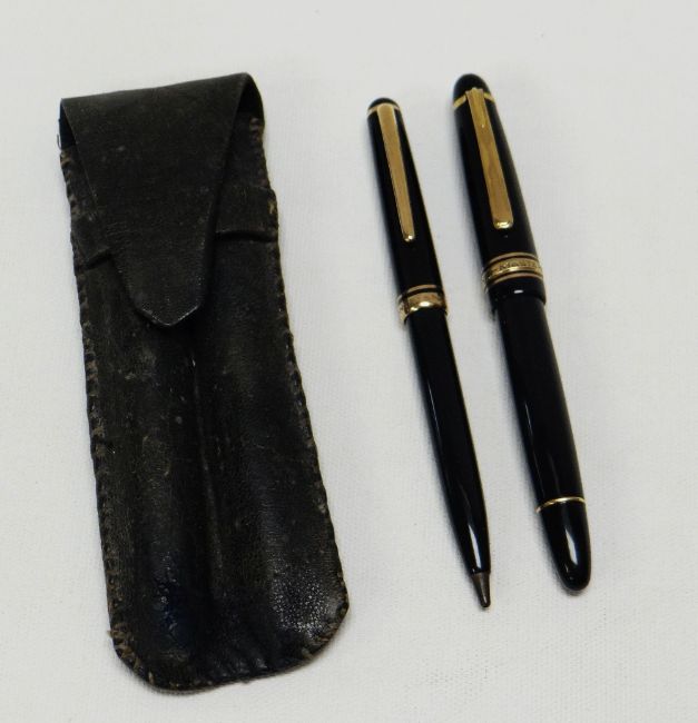 A VINTAGE MONT BLANC 'MASTERPIECE' FOUNTAIN PEN & PENCIL SET No.142, the black barrel with yellow metal fittings and complete with leather pouch