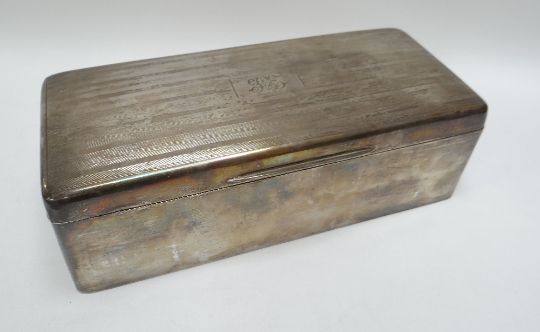 A SILVER CIGARETTE BOX of rounded rectangular form with machine-turned hinged lid and monogram, 23cms long