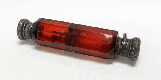 A CRANBERRY GLASS & SILVER SCENT / SMELLING SALT 'DOUBLE' with hinged foliate engraved lids, 12cms long