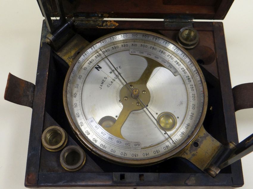 A JAMES WHITE OF GLASGOW SHIP'S COMPASS with silvered dial and brass case in a wooden and leather fitted box with accessories, 17cms diam