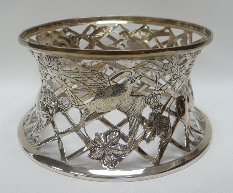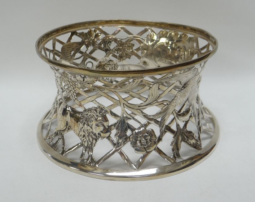 AN IRISH SILVER DISH RING of spool shape and of open lattice-work form decorated with embossed lions, birds and vines of fruit and flowers with a centre cartouche, 20cms diam at the base, Dublin 1913 by S D Neill, 9.3ozs