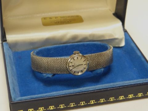 A BOXED TISSOT 9CT WHITE-GOLD LADIES WATCH having a circular silver dial, 26gms