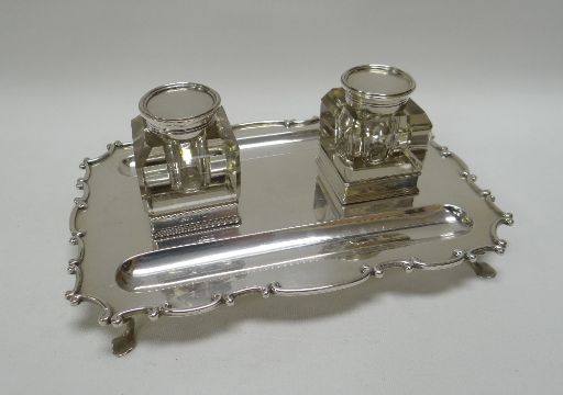 A SILVER DESK-STAND having a scrolling rim on four pad feet with pair of fitted inkwells, Birmingham 1904, stand 14.7ozs