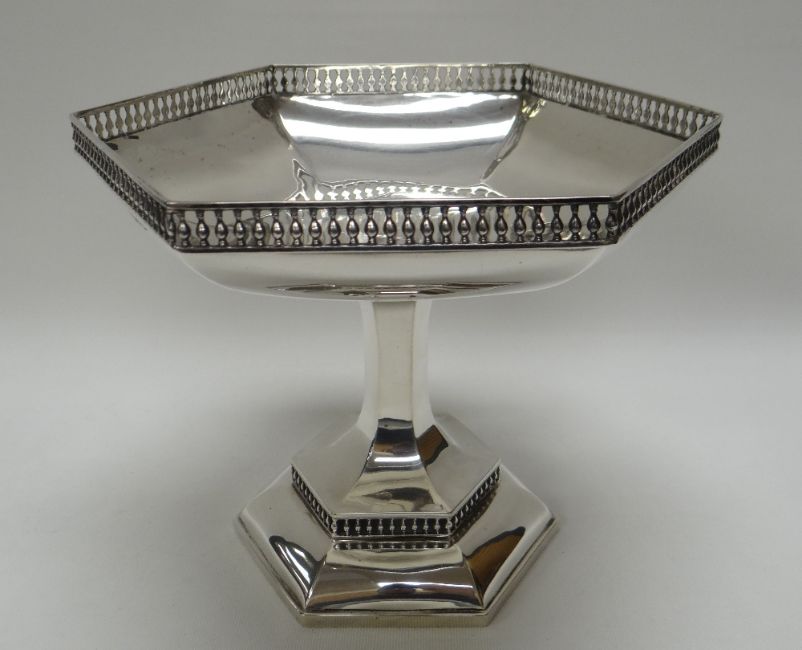 A SILVER TAZZA on hexagonal base with gallery dish top, Walker & Hall, Sheffield, 1898, 16ozs