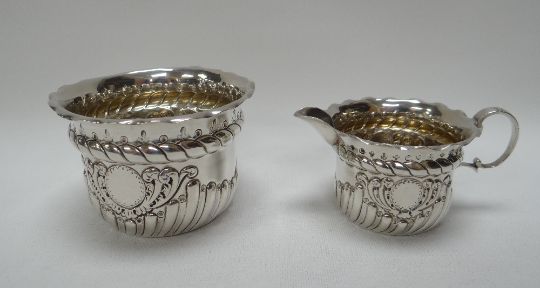 A SILVER SUGAR BASIN & MATCHING CREAM JUG both with repoussé decoration and cartouche, Birmingham 1886, 4.7ozs