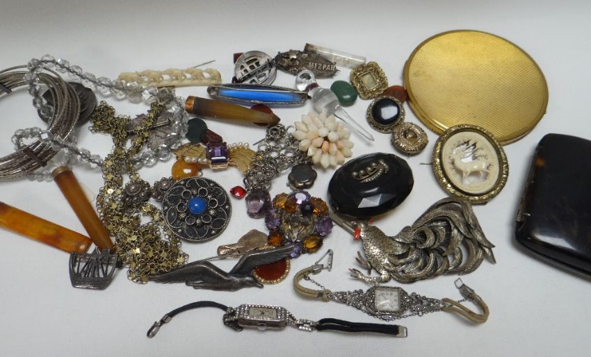 A TIN OF JEWELLERY & SMALL COLLECTABLES including cigarette holders, brooches etc