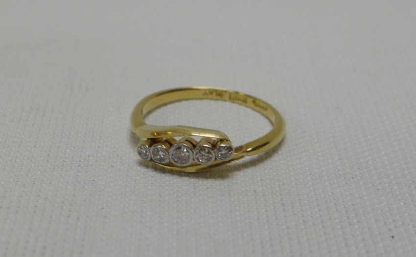 AN 18CT YELLOW GOLD & PLATINUM FIVE STONE DIAMOND RING, 2.4gms