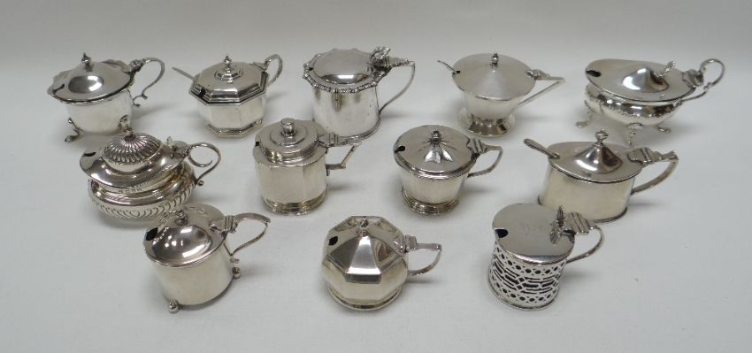A COLLECTION OF TWELVE SILVER MUSTARD POTS all with hinged lids of various form and decorations, 22ozs total (approx)