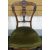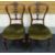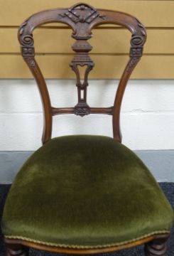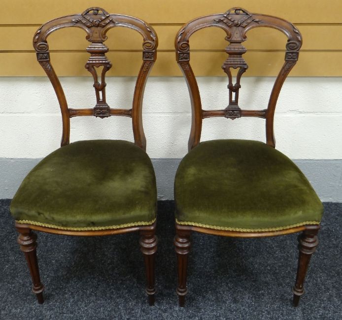 A PAIR OF MAHOGANY HALL CHAIRS having green upholstered stuff-over seats, tapered and fluted legs with ornate shaped and carved backs and with ribbon finials