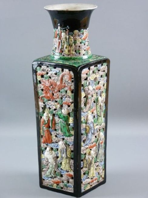 A CHINESE FAMILLE VERT RETICULATED VASE, square section with panels of eighteen immortals amongst clouds with a Canton palate dragon, flared cylindrical top section similarly decorated, the base with impressed six character Qianlong seal, 44 cms high, late 19th Century