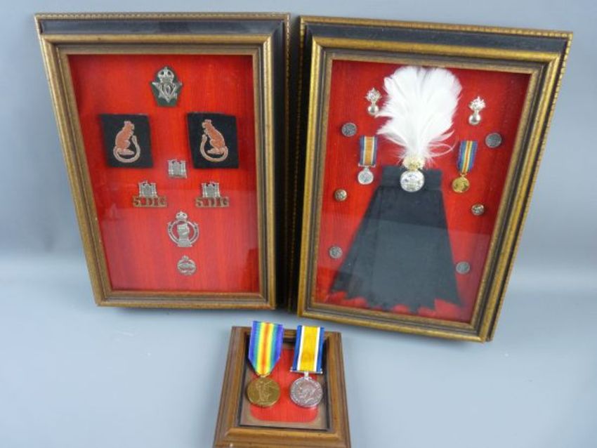 MILITARY MEDALS ETC, a 1914-18 George V service medal to 61567 Pte W B Morris, Welsh R, a 1914-19 victory medal to 14-35427 Pte J A Jones, S Wales Bord, a cased collection of Royal Welch Fusilier buttons etc and a cased collection of badges for the 5th Royal Inniskilling Dragoon Guards, two Desert Rat Association shoulder flashes, a Royal Armoured Corps World War II badge and a Fear Naught tank badge