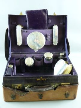 A LADY'S SILVER COMPACTUM, the case in quality deep purple leatherette, marked Mappin & Webb, only part complete but containing two pairs of silver backed brushes, a circular silver backed hand mirror and four silver topped glass containers and with other non-silver small boxes and a folder etc, complete with outer canvas case and the lid bearing a brass tablet with the name 'Miss Oliver Owen', assay marks for London 1910/1911