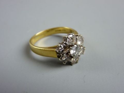 AN EIGHTEEN CARAT GOLD SEVEN STONE DIAMOND CLUSTER RING, 5.2 grms, the centre stone of visual estimate 0.45 carat and with surrounding six stones of estimated 0.2 carat each