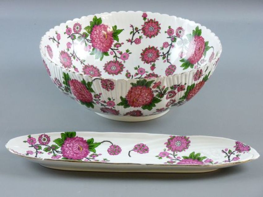 A SHELLEY/LATE FOLEY POTTERY BOWL & DISH, a 30.5 cms diameter ribbed bowl, transfer decorated with pink flowers and a 39 cms matching narrow dish