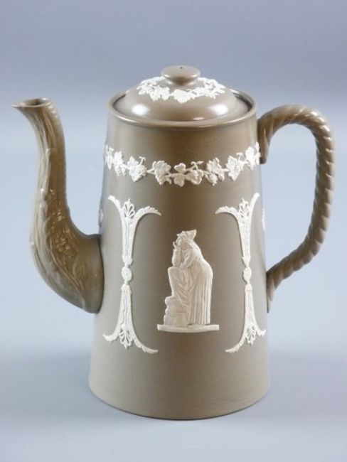 A DUDSON POTTERY TEAPOT/COFFEEPOT, the 25 cms tall pot with applied cameo style decoration, rope twist handle and floral embossed spout, marked to the base 'England', manufacturer's stamp to the interior of the lid, (one tiny chip to spout)