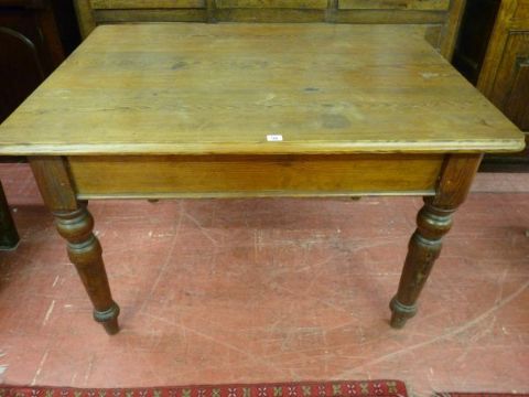 A VICTORIAN PITCH PINE FARMHOUSE TABLE, 76 cms high, 117 cms wide, 88 cms deep