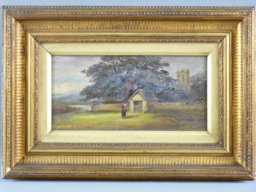 JOHN JOHNSON RCA oil on board - reputedly Betws-y-Coed old church, 14 x 29.5 cms approximately