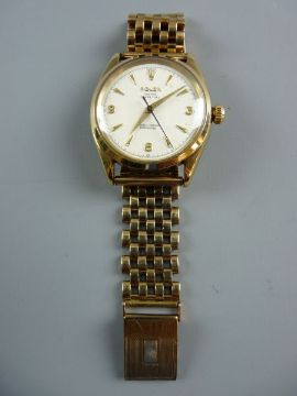A GENT'S NINE CARAT GOLD ENCASED ROLEX OYSTER PERPETUAL CHRONO WRISTWATCH having a circular dial and with a seven bar bracelet, in working order, 61 grms gross