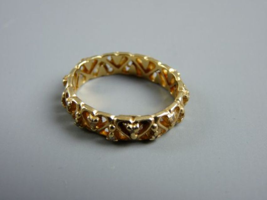 A FIFTEEN CARAT GOLD WEDDING BAND, scrolled and pierced and encrusted right round with tiny diamonds, 3.6 grms total