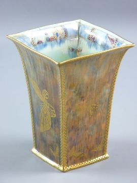 A WEDGWOOD LUSTRE VASE by Daisy Makeig Jones, a square shaped 19 cms high vase with flared rim having gilt edging and butterflies on a mottled tortoiseshell ground, pearl ware lustre interior with pseudo Chinese gilt highlighted panels and butterflies, one panel possibly incorporating M J monogram, Portland vase mark 'Wedgwood, England' to the base, pattern no. Z442 impressed, 14 cms approximately across the top, (crazing and staining to the interior, gilt edging and some highlighting worn, one or two scratches to the exterior)